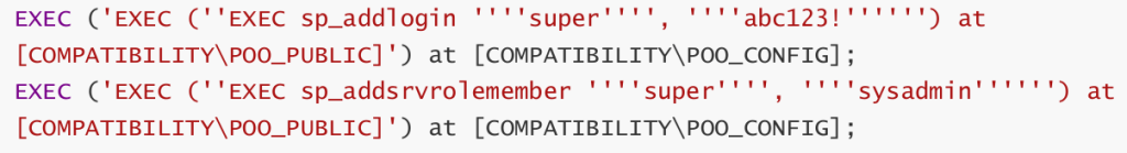 From the output above, We can see that the lazy DB admin uses sa account to create external DB link from POO_CONFIG to POO_PUBLIC where allowing the hacker to execute SQL query as DBA (Sysadmin) on POO_PUBLIC