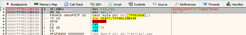 Below is the API (Adjust Privileges Token) without the AV hook hence any malicious action will not be stop or raise any flags. We can see the pattern mov r10,rcx