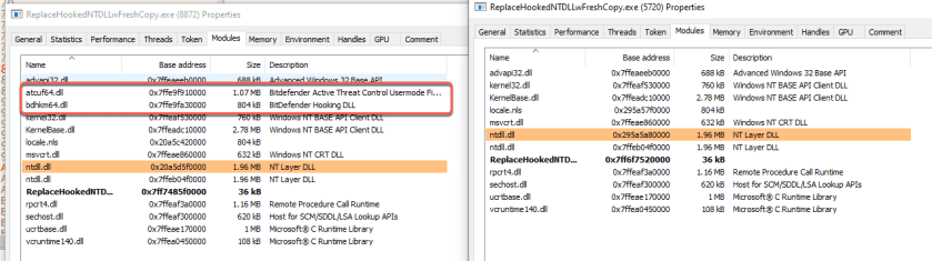 We can see that there are 2 NTDLL has been loaded. Number 1 is the fresh copy of ntdll.dll file that we load using hFile = CreateFile((LPCSTR)sNtdllPath, GENERIC_READ, FILE_SHARE_READ, NULL, OPEN_EXISTING, 0, NULL);. Number 2 is the ntdll.dll that is loaded during the process creation