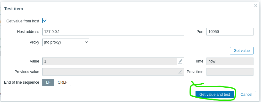The next things to do is to push the “Get value and test” button to run execute the curl command on the zabbix server