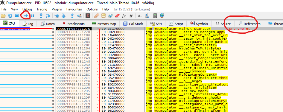 The first thing that we need to do to do the emulation is to create the memory dump of the malware. We can use x64debug to do this task.