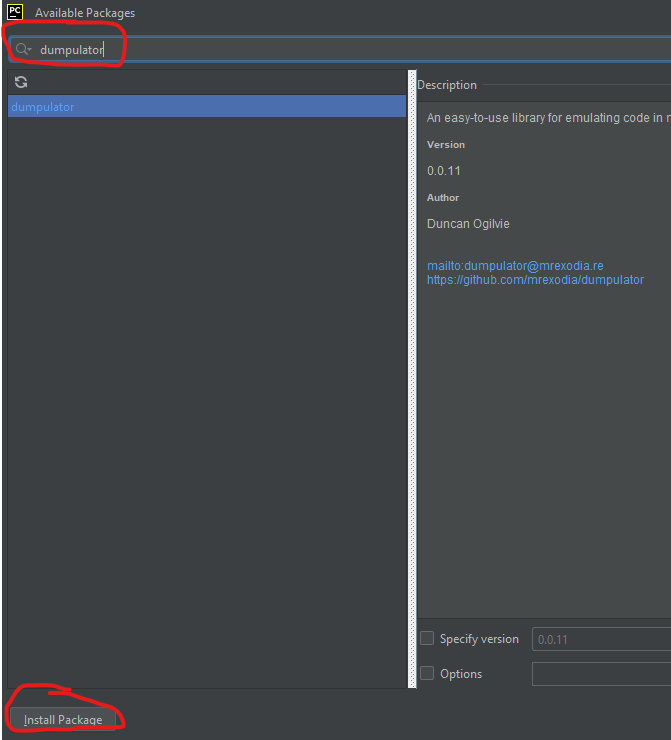 Search dumpulator on the search, select the module and install the package