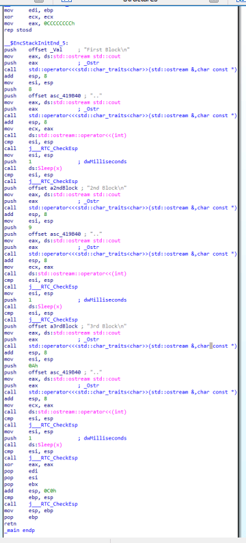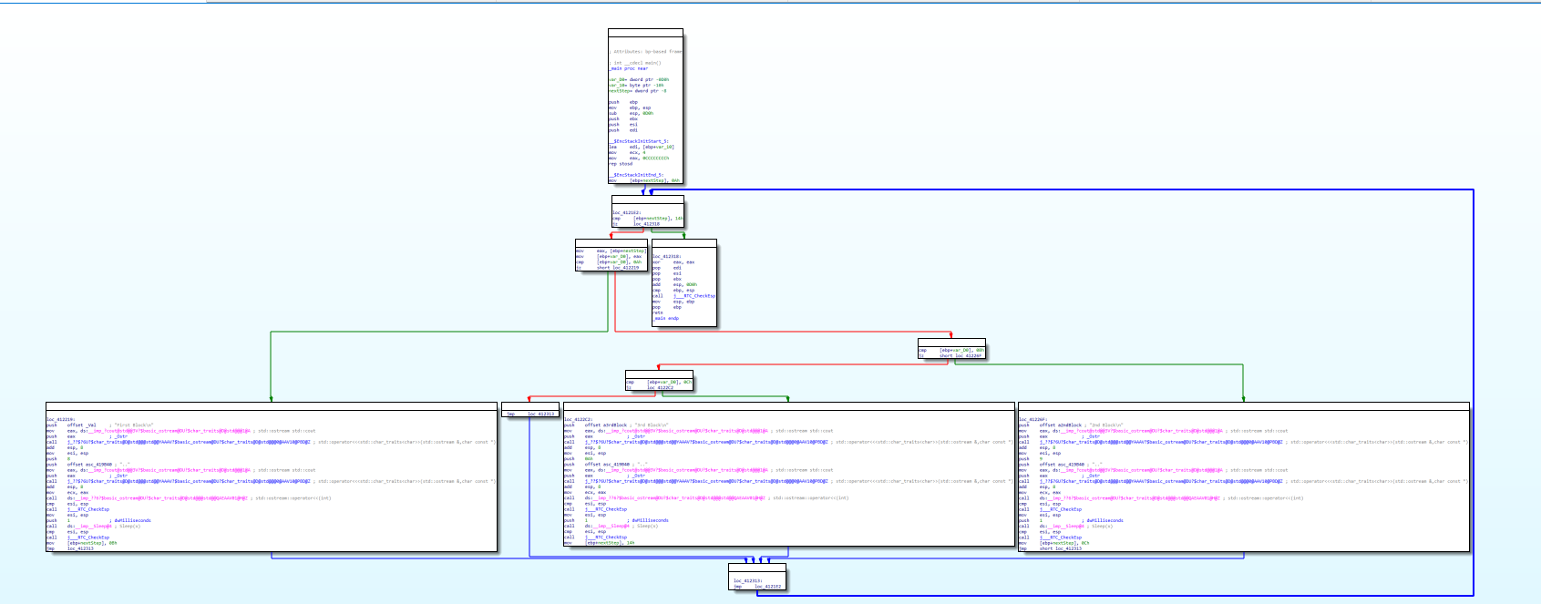 When we compiled that code into a PE and open it in IDA, The flow is very easy to understand from the very begining of the main function to the end of the main function. With this flow, application is very easy to understand because we can see obviously block of code sequencialy executed