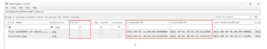 These fields, SI<FN, u Sec Zeros and Copied. SI<FN and u Sec Zeros, are relevant for identifying timestomping