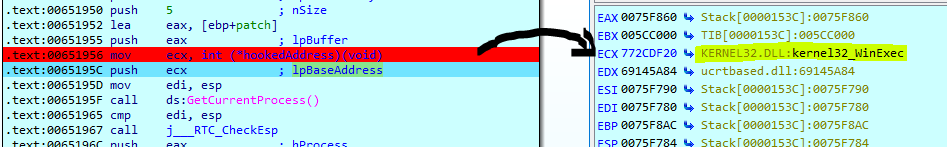 We can see the hookedAddress is now pointing to the Kernel32_WinExec. Keep your eye on the hookedAddress because we are going to overwrite this address