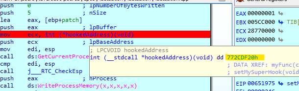 We see after the execution of hooking API code the hookedAddress has been overwritten to point to our evil function