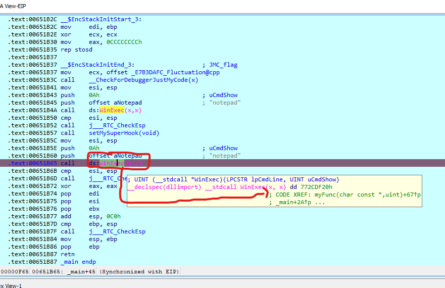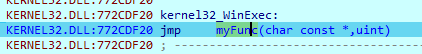 Now we can see that the call to winExec will actually be executing our evil function because the first 5 bytes have been overwrite with jmp myFunc