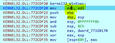 As you know that every windows API will start with the common 5 bytes of instruction mov edi, edi push ebp move ebp,esp where in hex 8b ff 55 8b ec