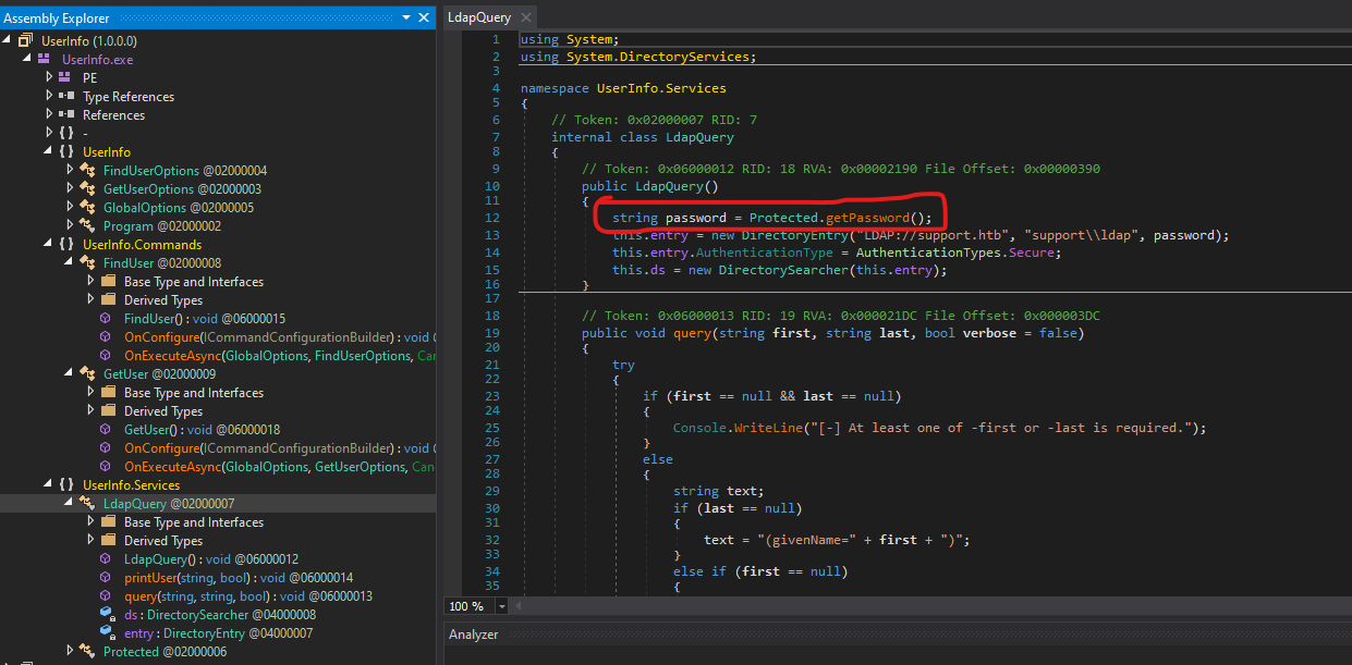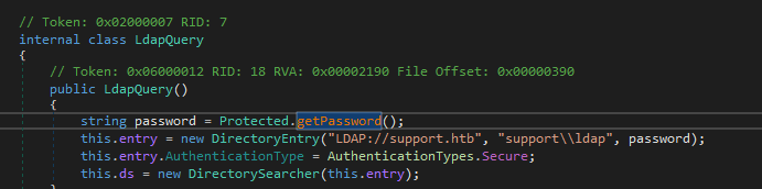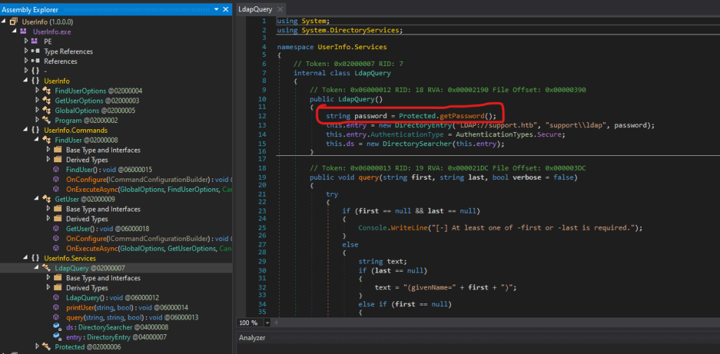 I used DNSpy to analyse the code. Not very long after analyzing the code, We can see that the application is used to query to the active directory with an account and password