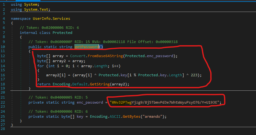 While experimenting with the box that I am attacking, One of the attack is to reverse .Net application to gather user password. Lets take a look, I found one application called userinfo.exe
