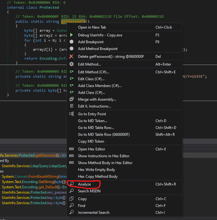 I will analyze where the getPassword is used in the application by using analyze function in DNSpy. Just right click on the class function and click on Analyze