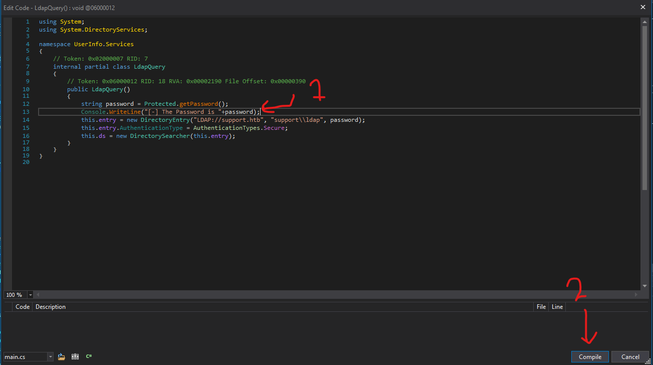 A new windows will be poped up where you can edit the code for that specific method in the class. Write the Writeline to print the password to the console and press compile