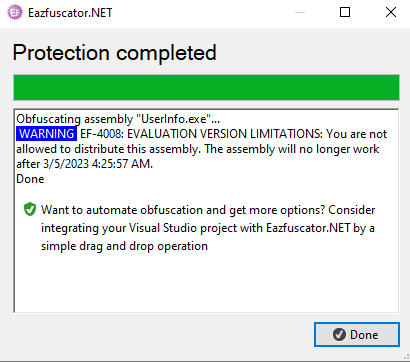 You just need to drag your application to the green side and a new PE will be generated with the code that has been obfuscated. Since, I am using the evaluation license then application will not be functional after the specified date after being obfuscated.