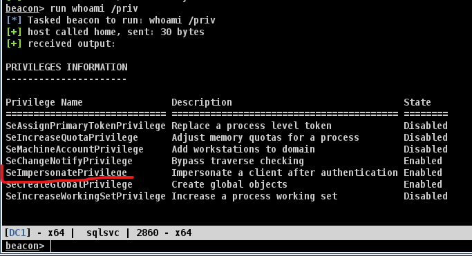 Enumerating the beacon security context by checking the privilege assigned to the account by using the command run whoami /priv