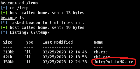 Based on the instruction on the website that we can run a program on the server with the JuicyPotato. So I made another beacon payload with Cobaltstrike and upload them to the same folder in C:\Temp or you can actually create a bat file which will contain the previous payload with powershell -enc [ENCODED_PAYLOAD] and upload the bat file to the server.