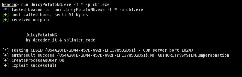 I executed the above command in order to exploit the SeImpersonatePrivilege rights and run the beacon on highest privilege.