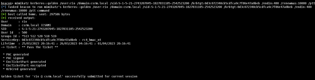 Golden ticket creation is success. The ticket has also been activated. You can check with the command below