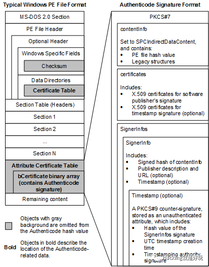 When the digital signature is generated, It will calculate the hash of all the highlighted part of the PE and save the information to the Checksum, Certificate Table and Attribute Certificate Table