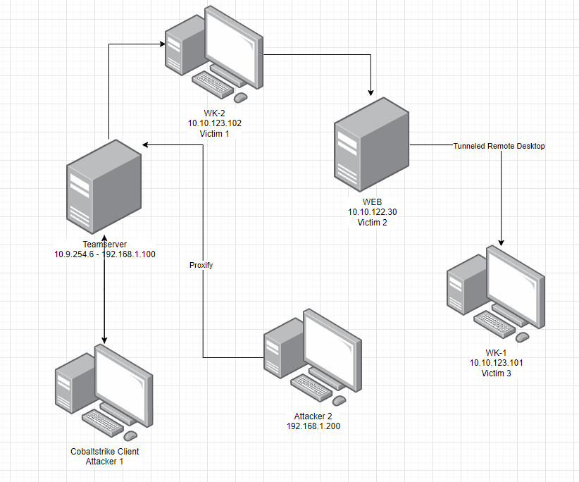 In the following scenario, I successfully compromised both the wk2 and dev systems. Leveraging the pivot mechanism alongside the Proxify application, I redirected the traffic from attacker 2 through the CobaltStrike tunnel.