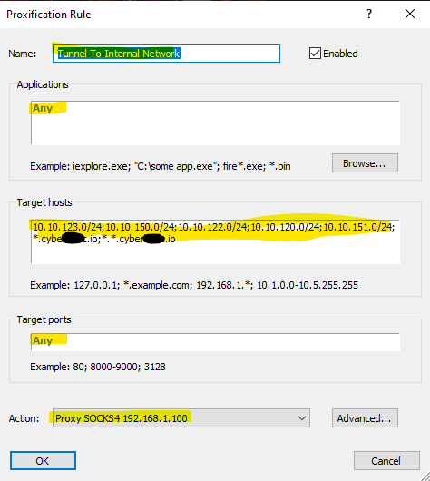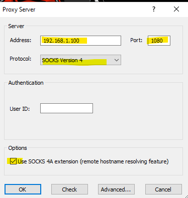 The first step is to setup the redirector which tell where the tunnel entry point. In this case we will redirect the traffic into 192.168.1.100 at port 1080