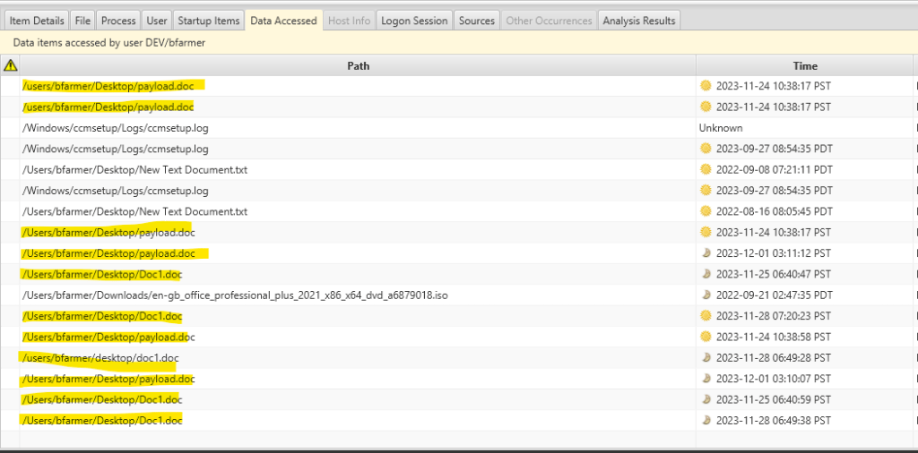 Discovering the compromised username, “bfarmer,” is crucial in cybersecurity forensics. To understand the user’s activities, my analysis focuses on identifying the accessed files or data, providing key insights into their actions.