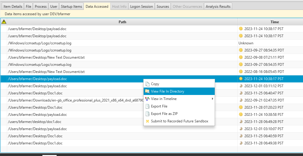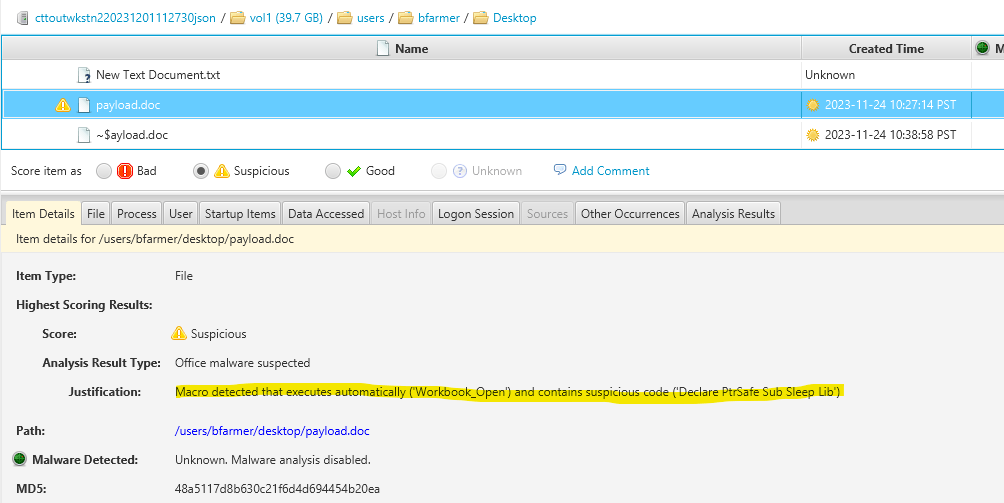 CyberTriage provides a comprehensive file analysis, revealing key insights. It alerts you to the presence of a suspicious macro containing code commonly exploited by adversaries to automatically deploy malware