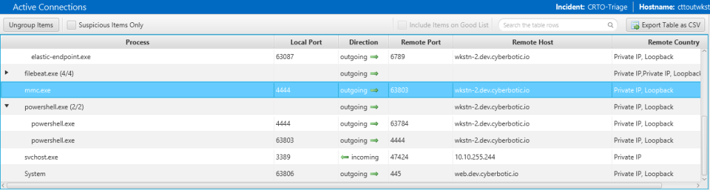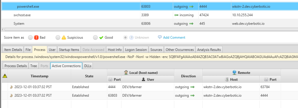 Exploring active connections reveals a significant finding: PowerShell is initiating an outbound connection to port 4444, with the remote host identified as localhost. This aligns seamlessly with our LocalOnly listener designed for lateral movement. In essence, the connecting process is PowerShell