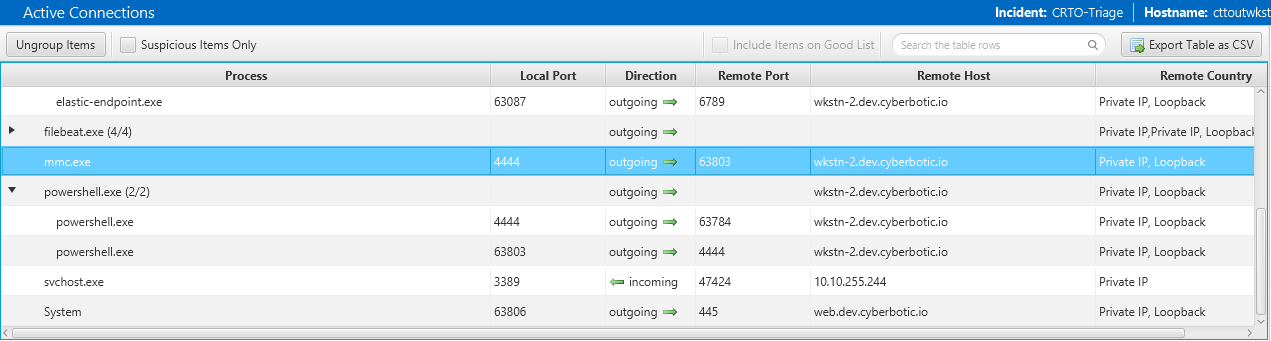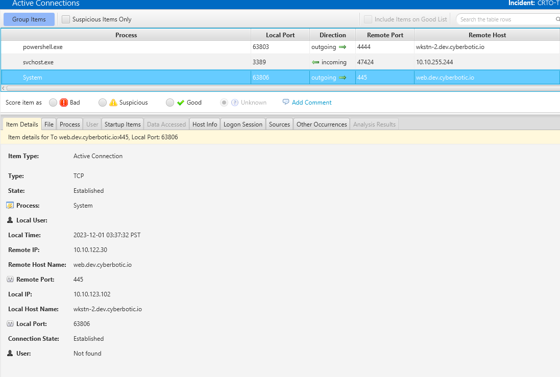 When flagging a potential threat, CyberTriage seamlessly connects the dots by correlating various artifacts. If a process is detected engaging in inbound/outbound connections, it triggers an alert. This analysis also involves cross-referencing with startup items, providing a comprehensive approach to identifying and addressing cybersecurity incidents