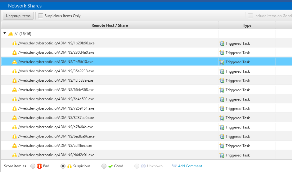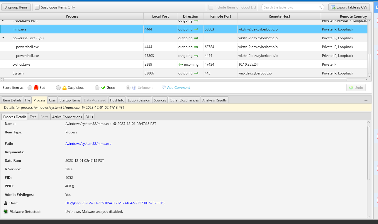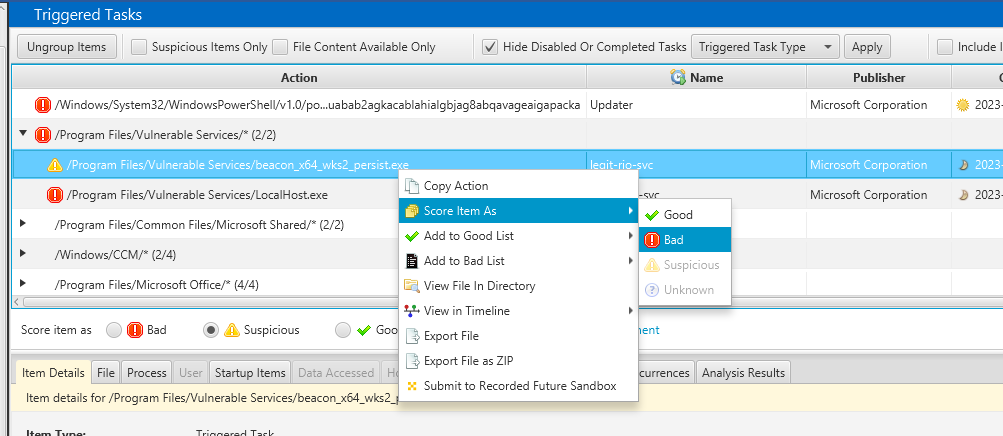 CyberTriage doesn’t immediately identify these elements as malicious. However, you can manually designate them as bad with a simple right-click and selecting “Score Item As –> Bad.” This hands-on approach allows for a more personalized assessment of potential threats