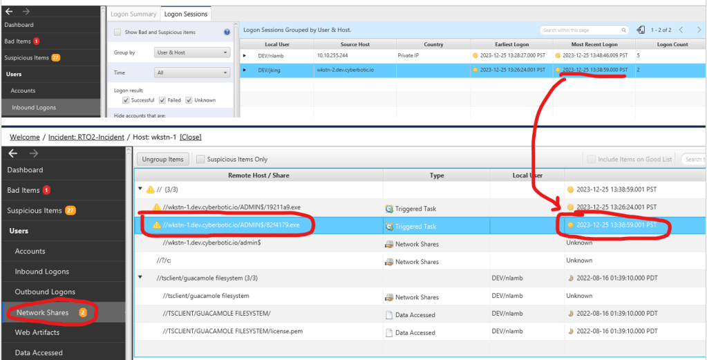 Upon analyzing the situation, it is evident that there is a correlation with another artifact related to PSEXEC. It is known that PSEXEC copies a file into remote host ADMIN$ and initiates its execution as a task. The login time of DEV/jking aligns with the PSEXEC task time, indicating a match consistent with the behavior of PSEXEC.