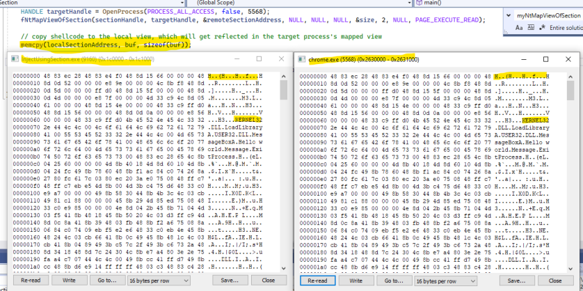 fNtMapViewOfSection(sectionHandle, GetCurrentProcess(), &localSectionAddress, NULL, NULL, NULL, &size, 2, NULL, PAGE_READWRITE);