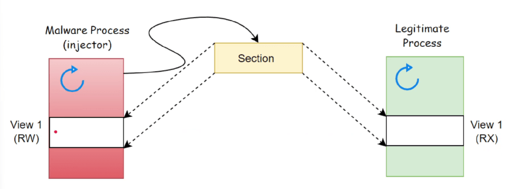 Views are utilized to access shared resources, allowing a process to utilize a section of memory. In certain scenarios, a local view is generated for the local malware process, while a remote view is created for a remote process.