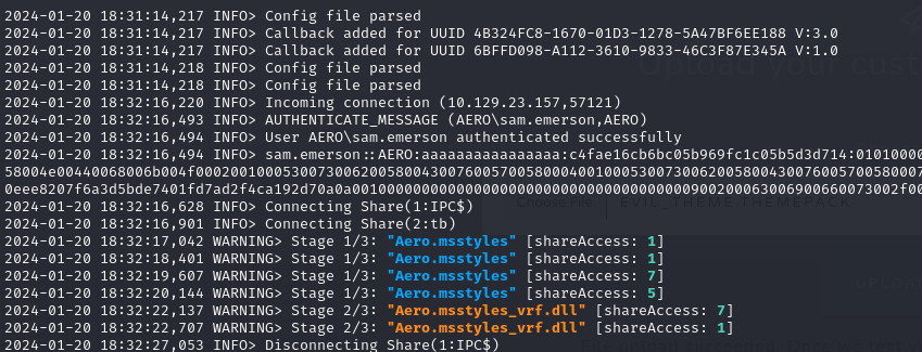 Upon successful theme upload, the theme pack undergoes server processing, thereby triggering our exploit. Subsequently, our DLL file is deployed to the victim’s machine, initiating the execution of our Microsoft Fiber with the CobaltStrike payload.
