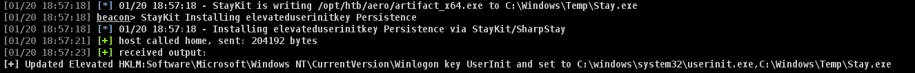 To ensure the success of the operation, it is crucial to establish persistence, which will enable the retrieval of the beacon following a restart of the victim’s machine. I employ the use of staykit to automate this process effectively.