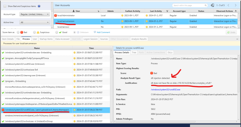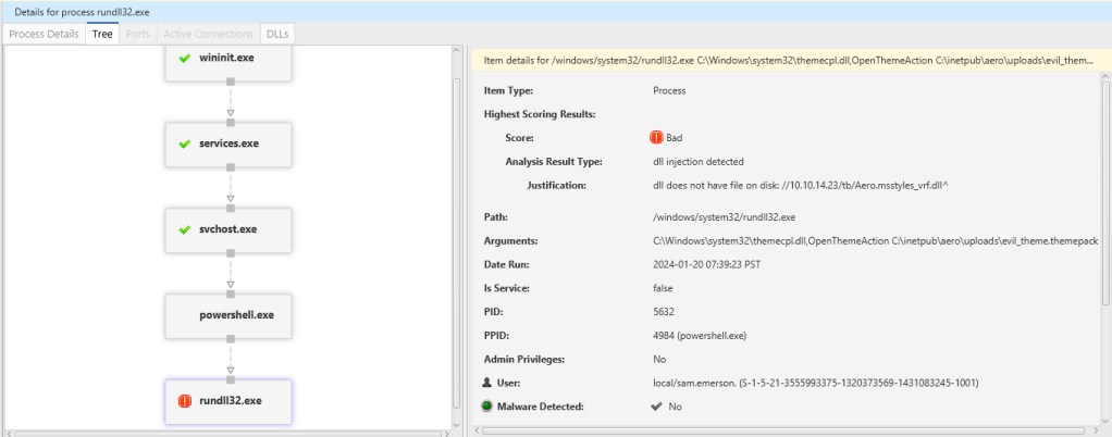 We have identified a process flagged as malicious due to its detection of conducting DLL injection. As mentioned in my prior post, this is the file utilized to establish the initial foothold, exploiting CVE-2023-38146 through themepack exploitation.