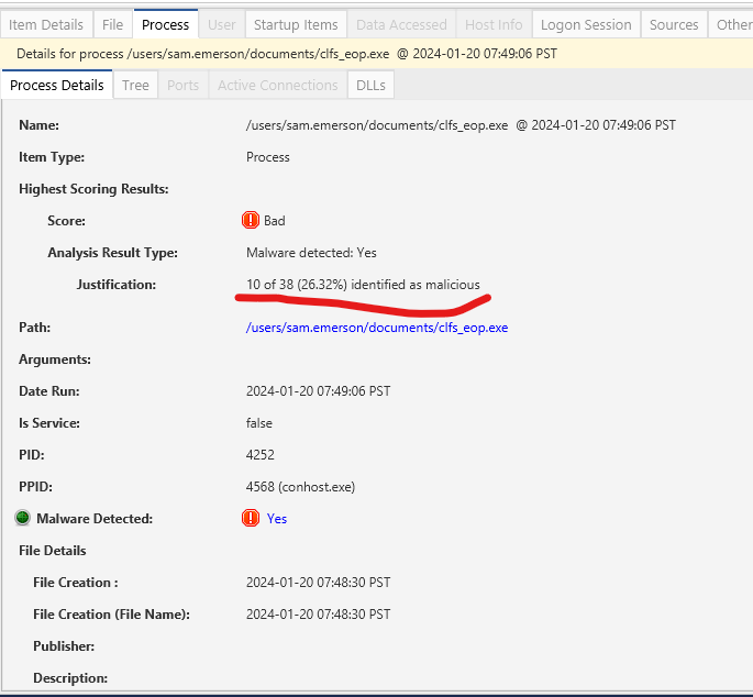 We have discovered an additional application, cifs_eop.exe, running from the same directory as the previously discussed process. As mentioned in my previous post, I utilized this executable to exploit the CVE-2023-28252, which resulted in a beacon connection. CyberTriage has flagged this as malicious due to being detected by 10 out of 38 scan engines.