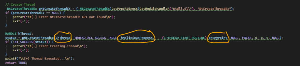The last part is to create a thread. You know that a process must have at least one thread to run. So we create a thread to execute our code