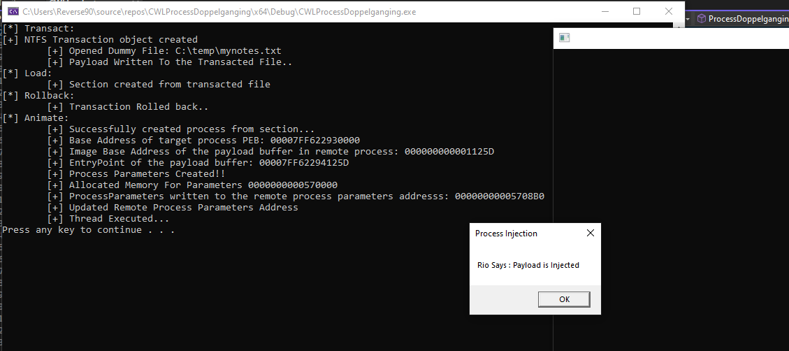 I came across a process injection technique known as Doppelganging, which gained attention during the Black Hat conference in Europe. The technique, although not the latest in the industry, but it struck me as particularly ingenious and unconventional. More information about this technique can be found in the following link: https://www.blackhat.com/docs/eu-17/materials/eu-17-Liberman-Lost-In-Transaction-Process-Doppelganging.pdf.