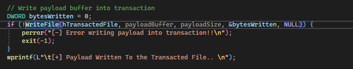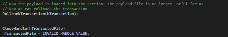 Roll back the NTFS transaction. Executing the rollback process sends a signal to the operating system, indicating the cancellation of the writing process, ensuring that our payload never interacts with the disk. Nonetheless, it is important to note that our payload has indeed been written to a specific section of memory.