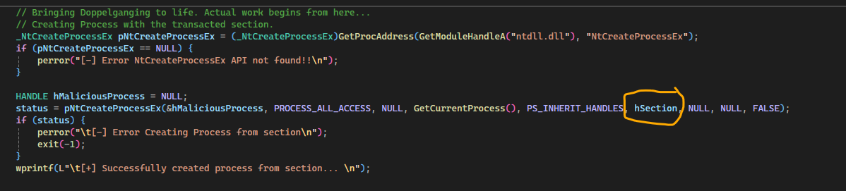 The next steps is to create section. The section will become the base of the our process. Remember that our malicious payload is now settled in a memory range