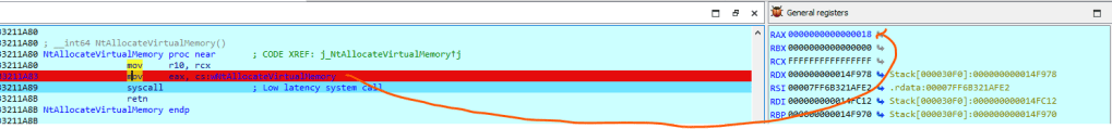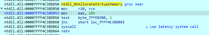We can see that the call to NtAllocateVirtualMemory is now has been overwritten and directly call the SSN from the our code.