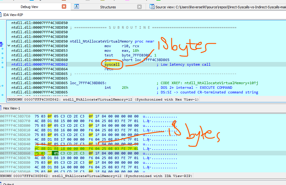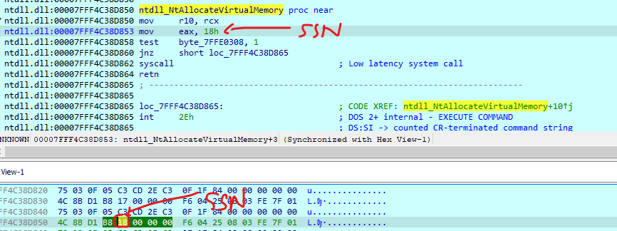 Beside obtaining the SSN, it is crucial to also acquire the reference, specifically the syscall located 18 bytes from the beginning of the API address.