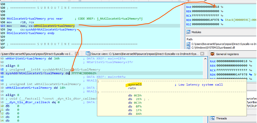- Firstly, the syscall command is executed within the memory of the ntdll.dll, rendering it legitimate for the EDR.