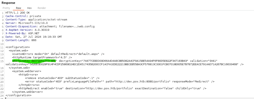 Luckily, my pentesting lab has another vulnerability that lets us read any file on the server. So, we exploited this to read the web.config and grab the key, encryption algorithm, and etc.