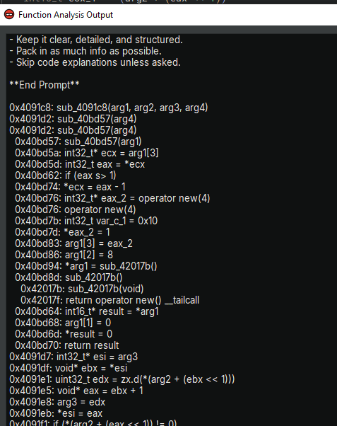 Next, I gather the code and hand it over to the AI for analysis. I’m working with a Python script that’s a Binary Ninja plugin, designed to rename variables based on a JSON file. The AI checks out the code’s structure and variable usage, then spits out a JSON map linking function addresses to new variable names. Here’s what that JSON looks like: