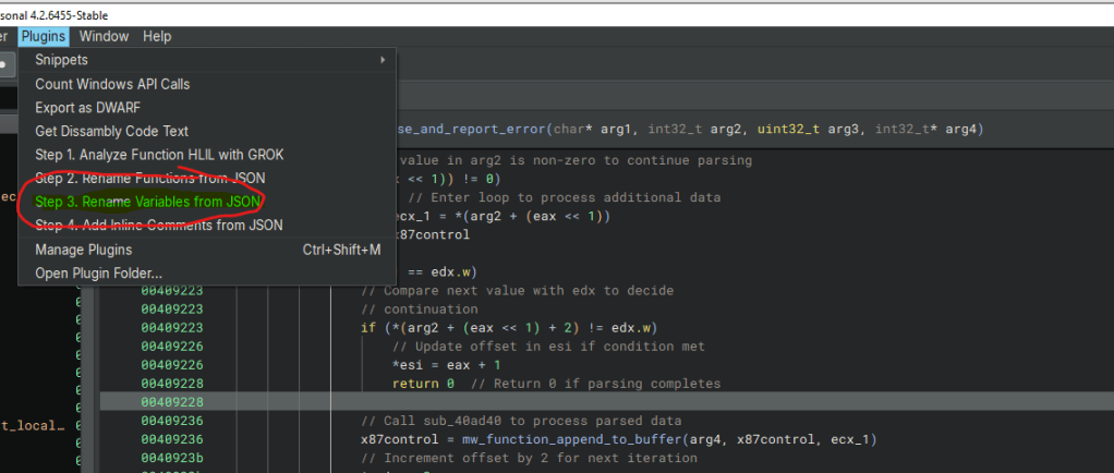 - Plugin Registration: The script hooks into Binary Ninja with PluginCommand.register, adding a menu option called “Step 3. Rename Variables from JSON.” It’s how I launch the whole process from Binary Ninja’s interface.